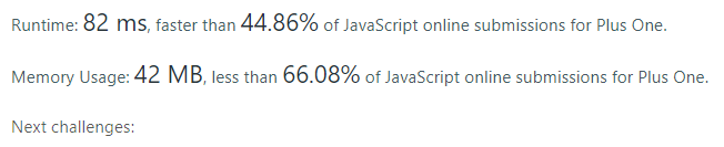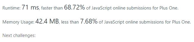 그냥 for문을 사용해 0~8까지의 숫자라면 +1를 해줘도 다른 자리에 영향을 주지않기 더해주고 바로 반환해줬다. 반면, 9라면 해당 자리를 0 으로 만들어준다.(어짜피 다시 for문을 돌면서 앞에 자리에 1을 더해줌) 만약 배열의 길이가 1자리 수면 앞에 1을 unshift를 해주는 방식으로 풀었다.